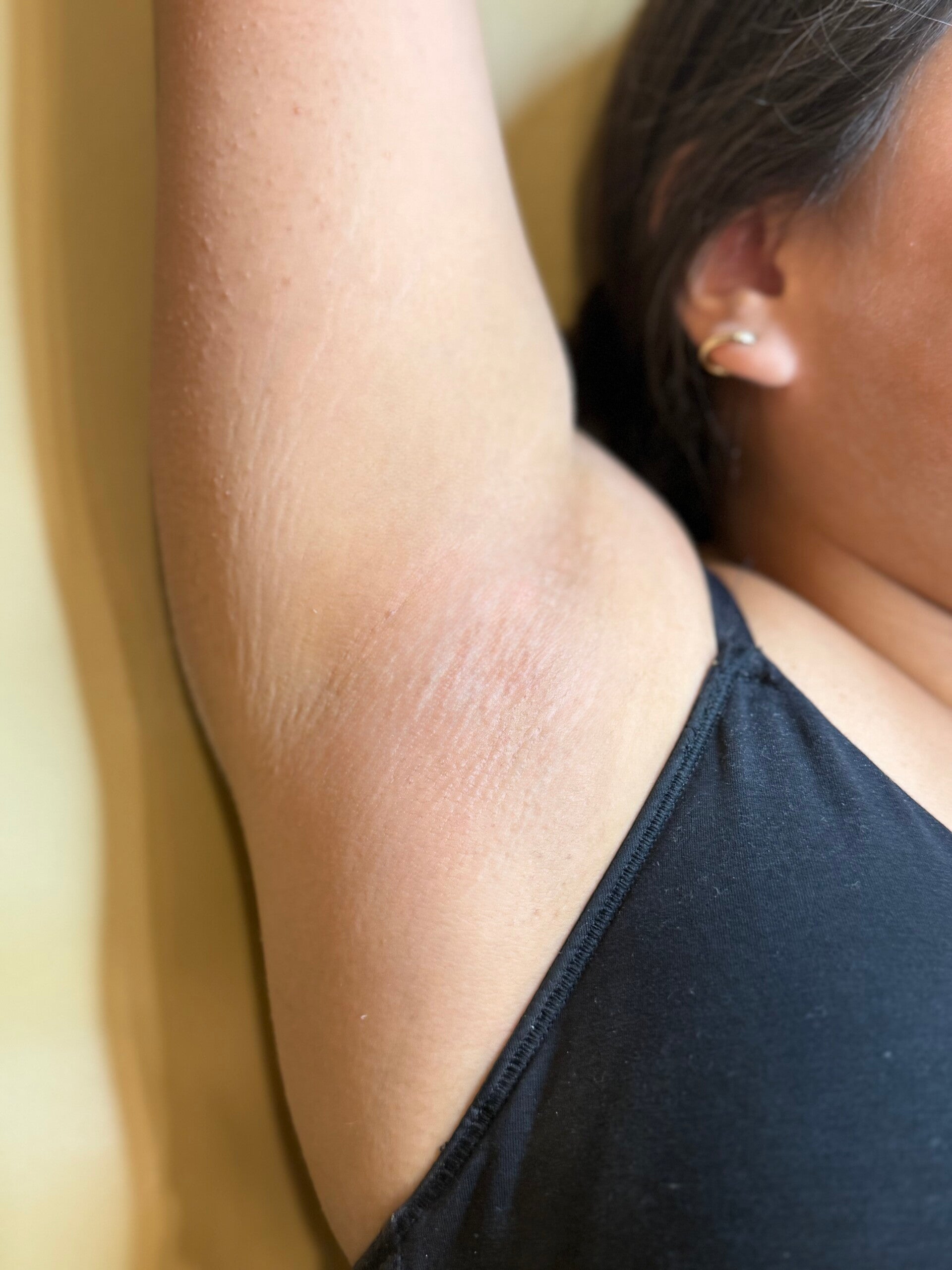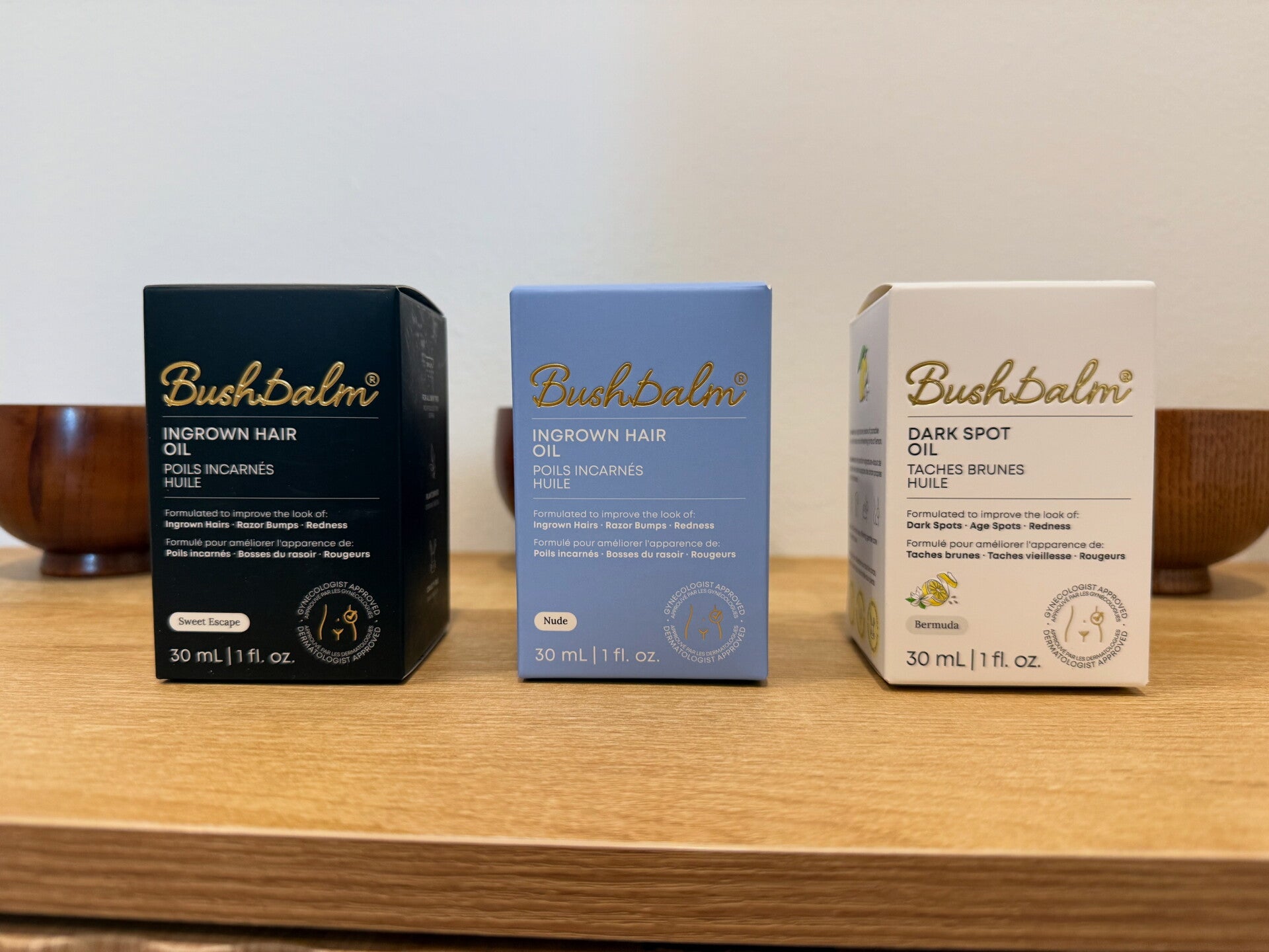 Products: Bushbalm (body and face soothing/calming gel mask, Exfoliator, brightner & ingrown serum)
